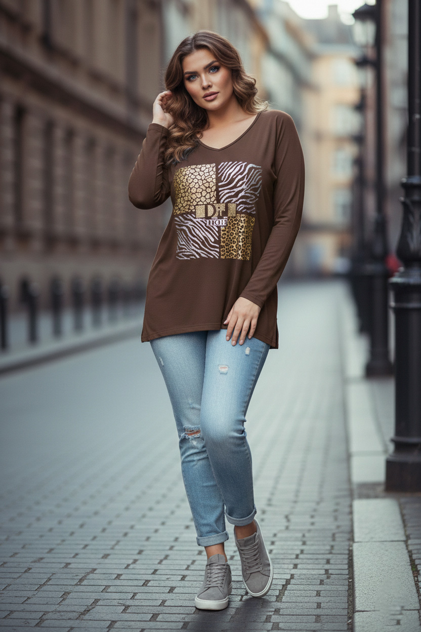 ΚΩΔΙΚΟΣ: 5020cafeΓυναικεία Μπλούζα V-neck Καφέ μπλούζα με το χρυσό και ασημί τύπωμα Curve-Plus Size
