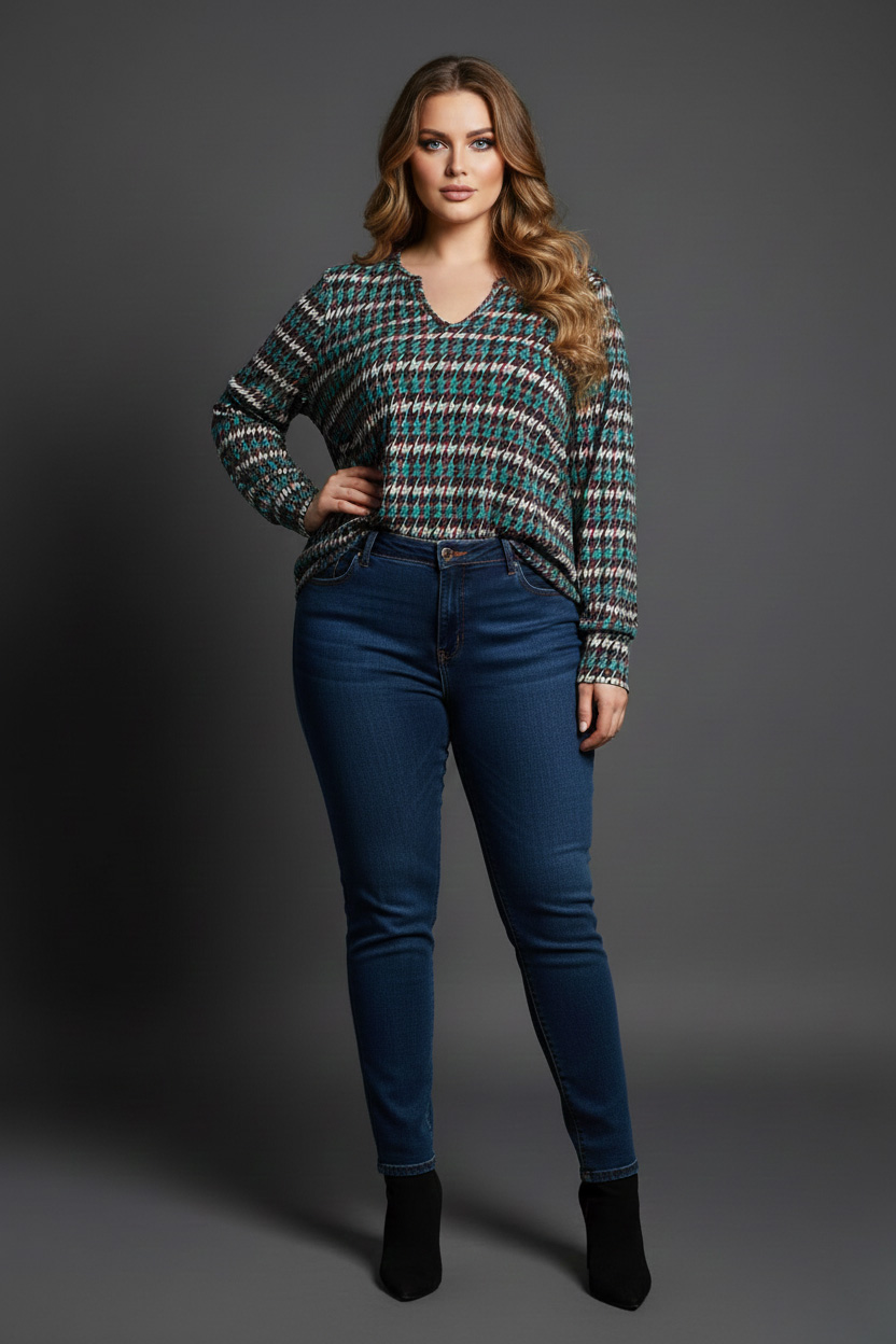ΚΩΔΙΚΟΣ: alex0132prsnΓυναικεία Μπλούζα V Με Μοτίβο Καρό, σε Ψιλό Πλεκτό Curve-Plus Size
