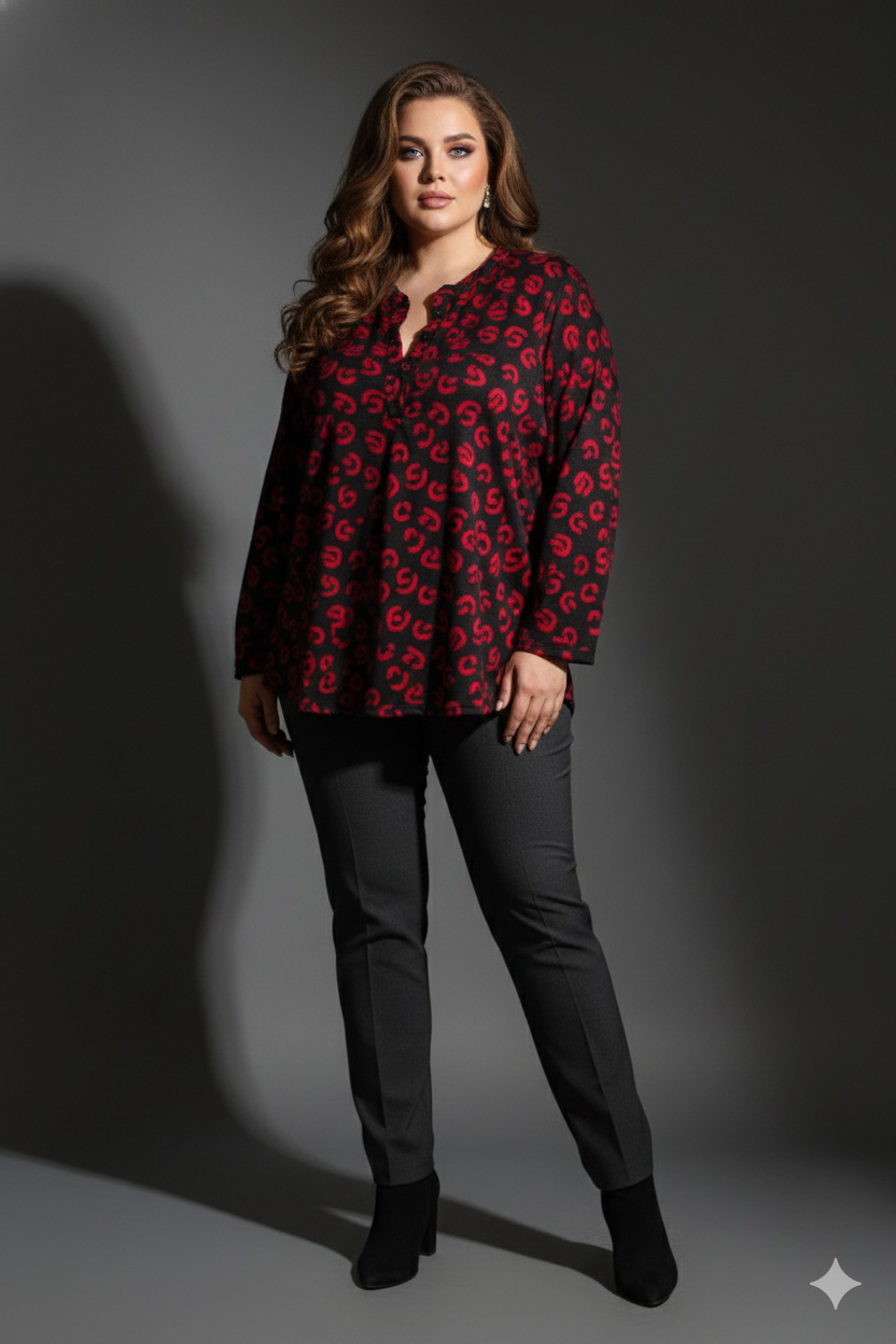 ΚΩΔΙΚΟΣ: 5007kmΓυναικεία Μπλούζα Μαύρη Με Κόκκινο Μοτίβο Λεπτό Πλεκτό Με Κουμπιά ελαστική Curve-Plus Size