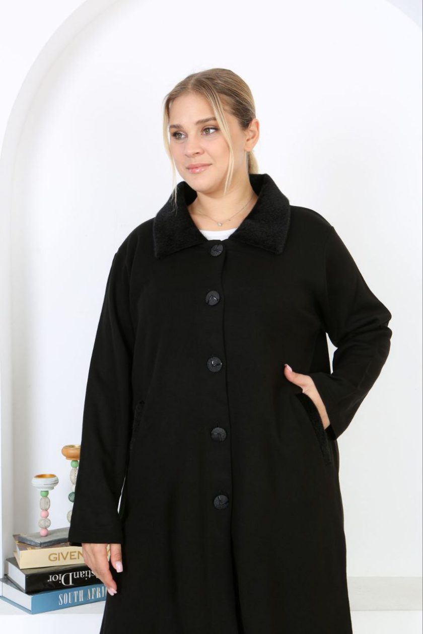 ΚΩΔΙΚΟΣ: palto7002blackΓυναικεία Παλτό βελούρ Μαύρο Με Φόδρα Με Κουμπιά Τσέπες Curve-Plus Size