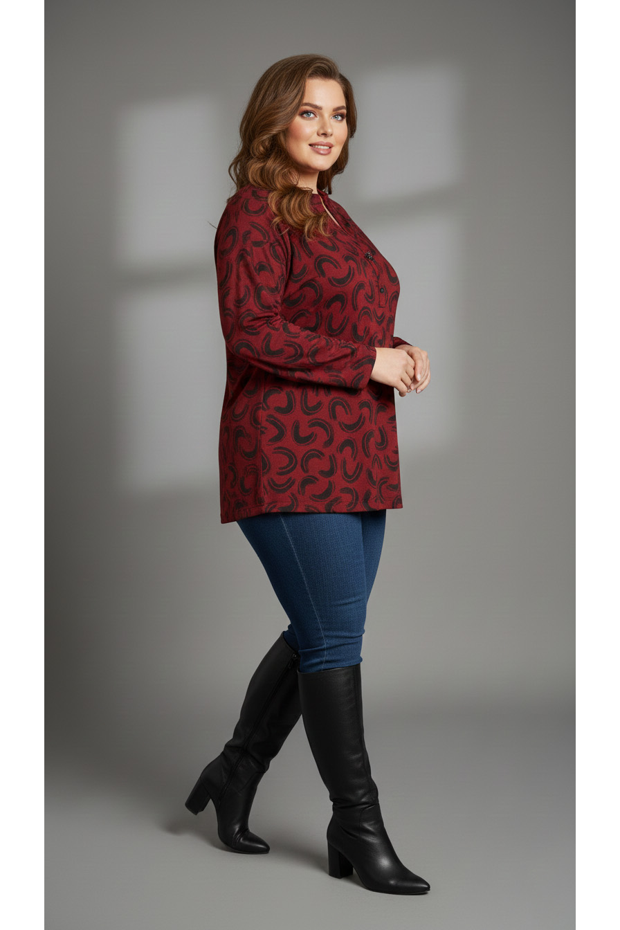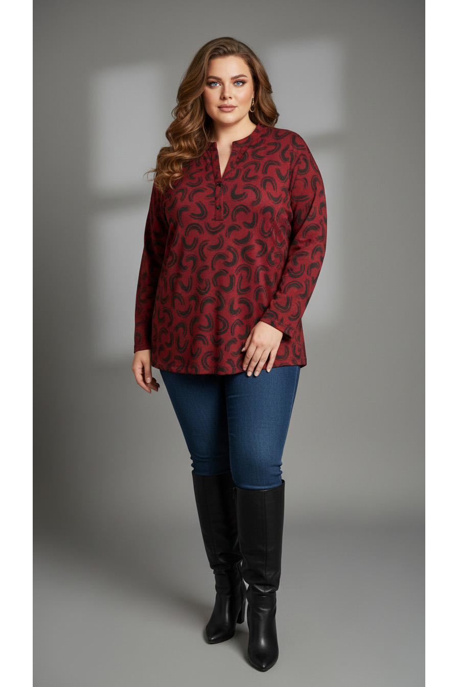 Γυναικεία Μπλούζα Μπορντό Με Μαύρο Μοτίβο Λεπτό Πλεκτό Με Κουμπιά ελαστική Curve-Plus Size