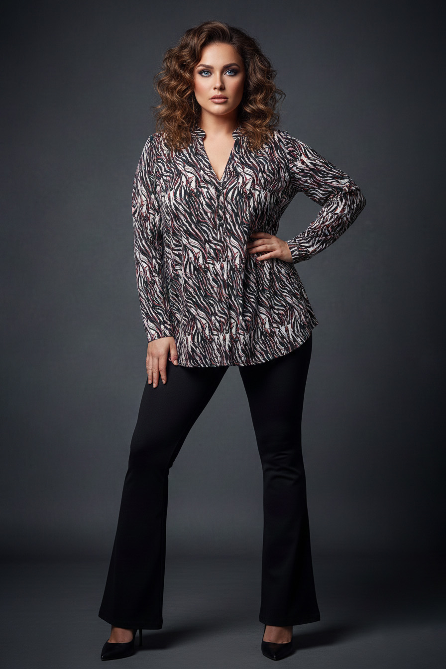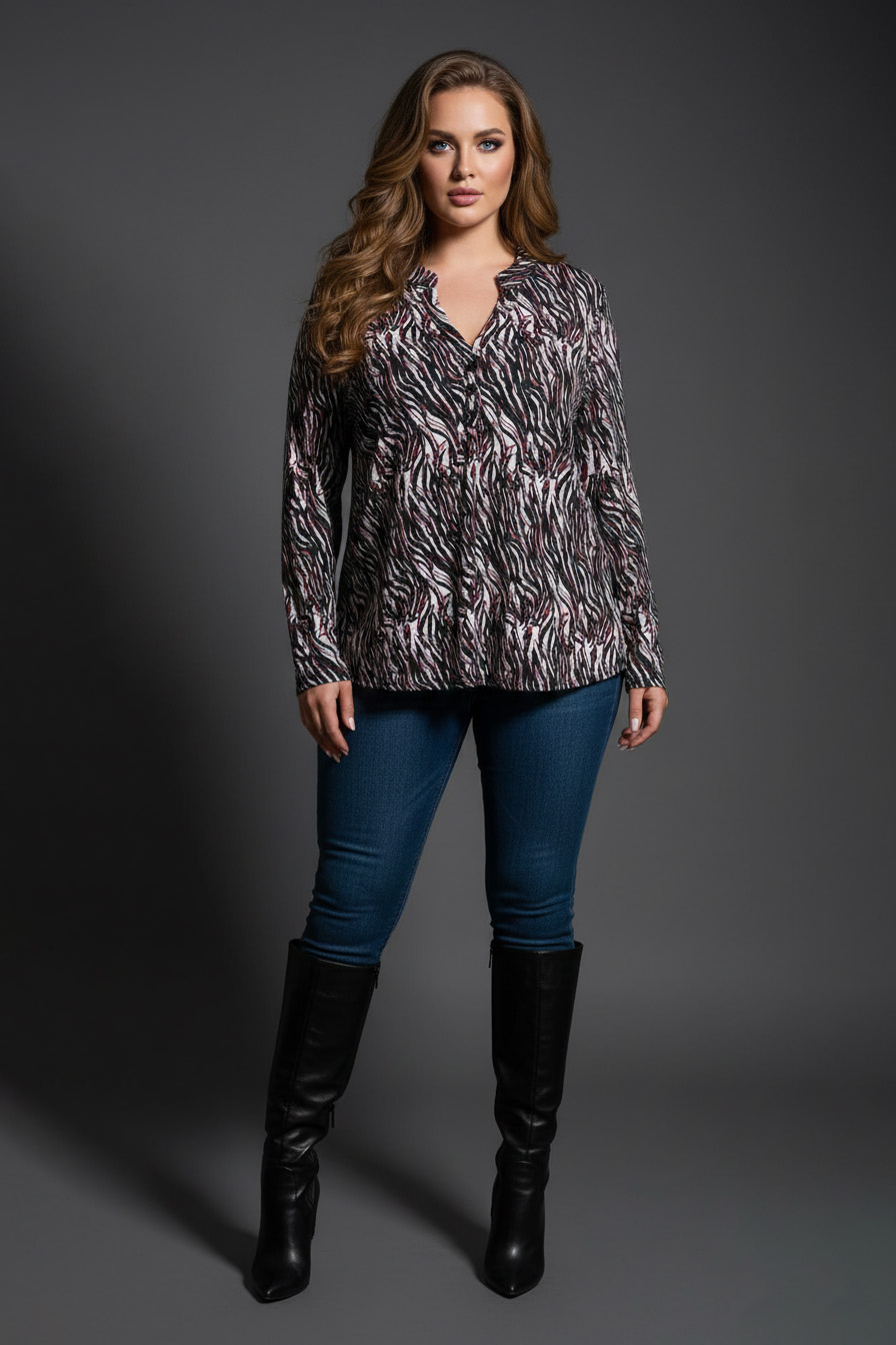 Γυναικεία Μπλούζα Εκρού Τύπου Ζέβρα σε Ψιλό Πλεκτό Με 3 Κουμπιά Curve-Plus Size