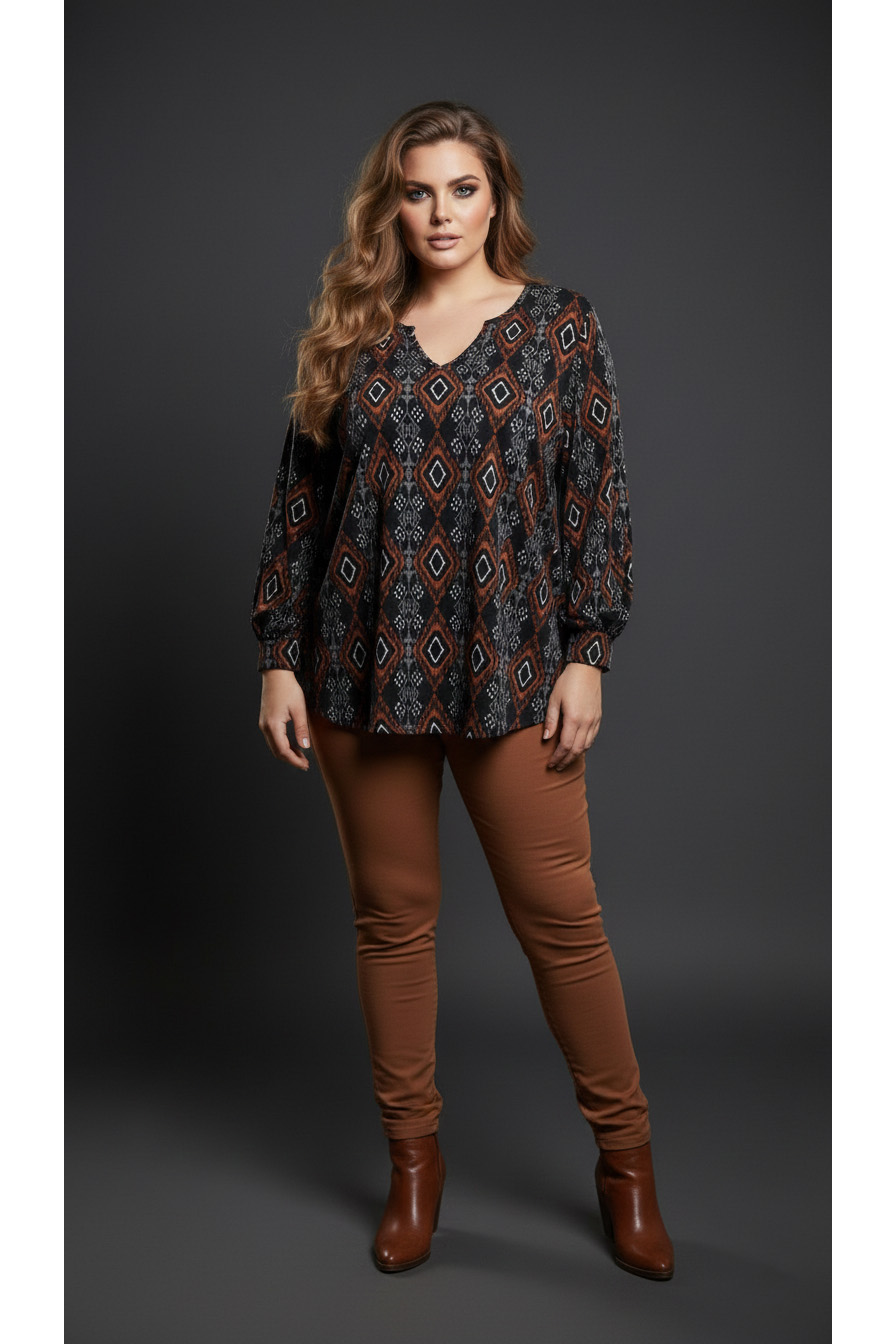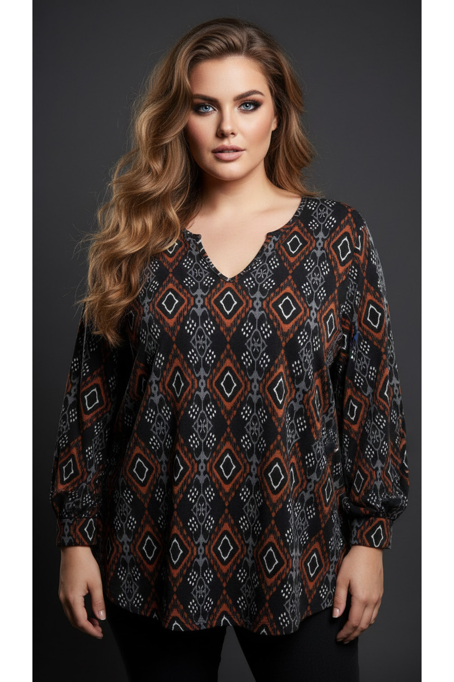 Γυναικεία Μπλούζα V Με Γεωμετρικά σχίσματα, σε Ψιλό Πλεκτό Curve-Plus Size