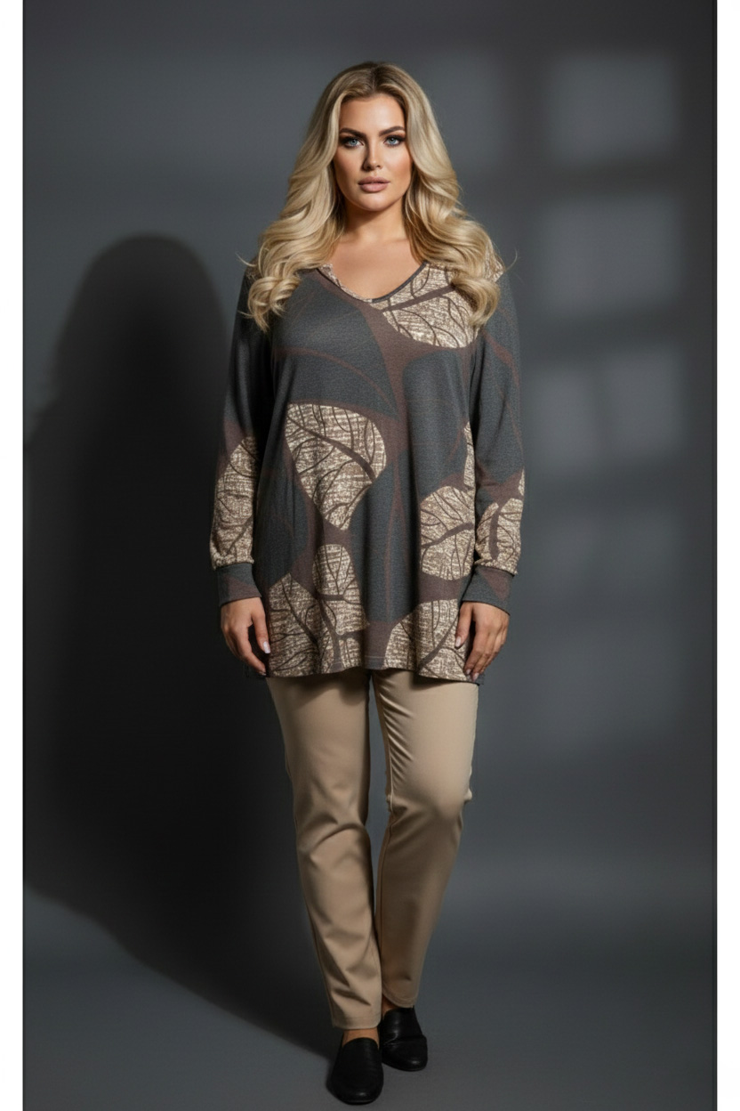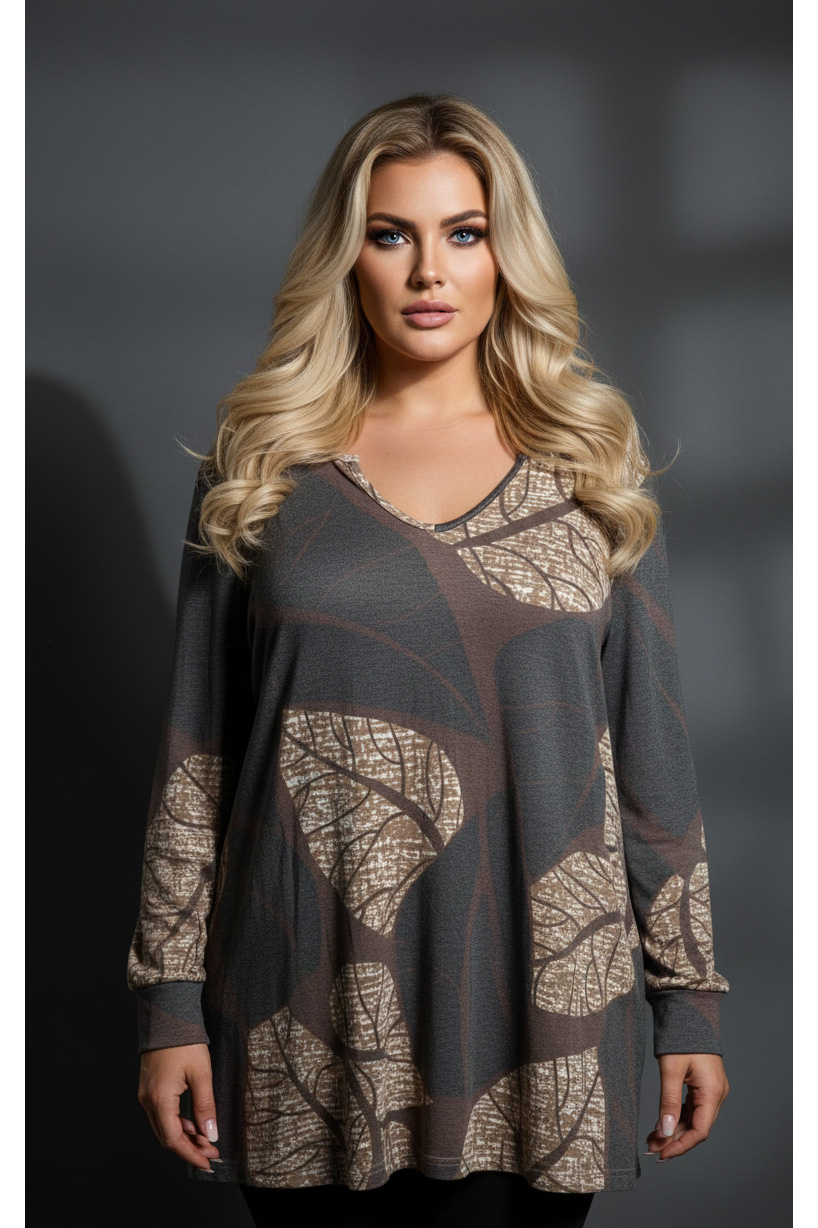 Γυναικεία Μπλούζα V Με Μοτίβο Φύλλα, σε Ψιλό Πλεκτό Curve-Plus Size