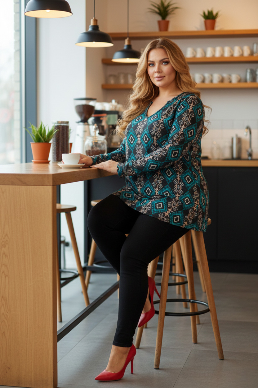 Γυναικεία Μπλούζα V σε Ψιλό Πλεκτό Εμπριμέ Πετρόλ Μοτίβο Curve-Plus Size