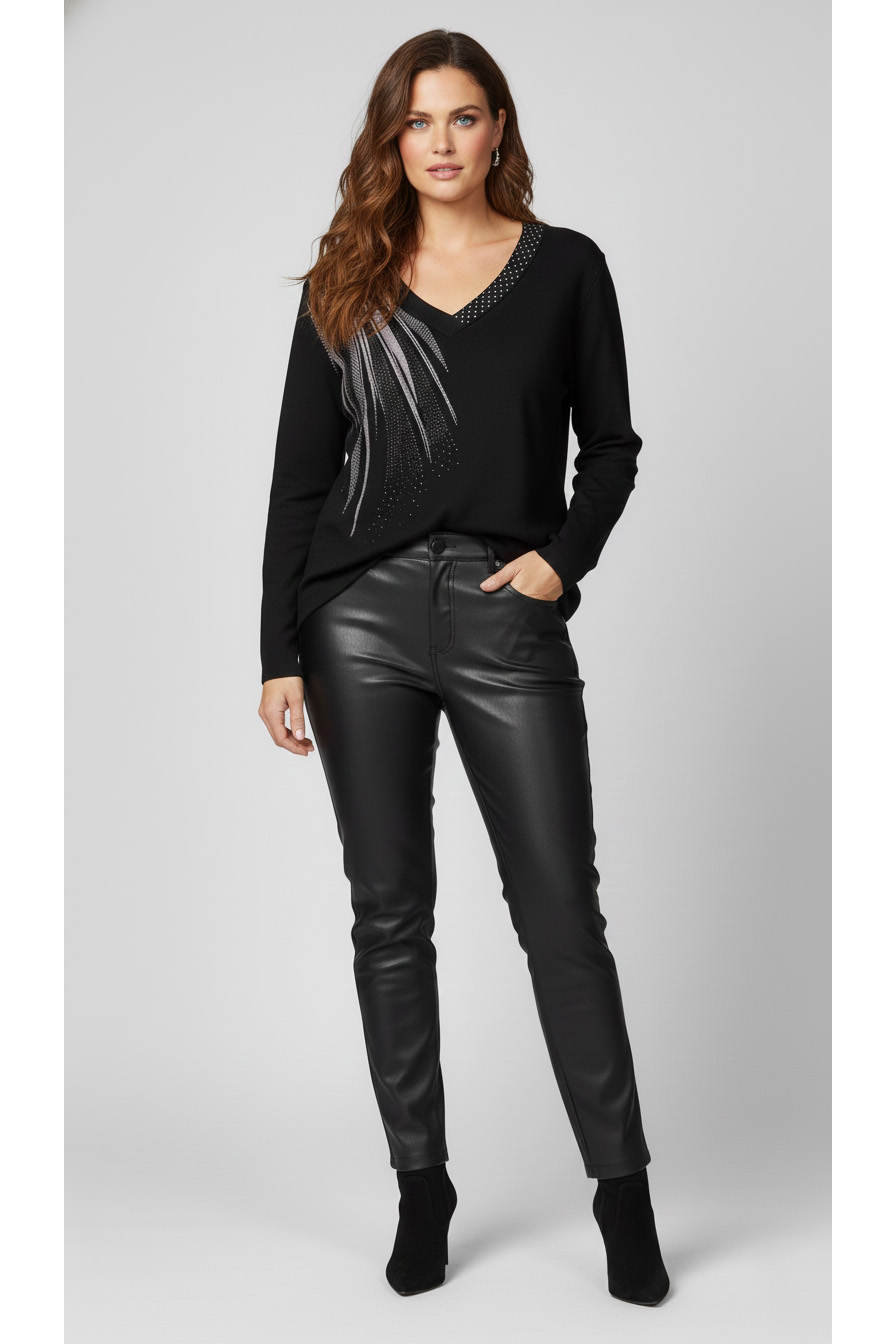 Αυτή είναι μια ωραία μαύρη μπλούζα με ενδιαφέροντα σχέδια! Έχει λαιμόκοψη V και ένα διακοσμητικό στοιχείο με πουά στην άκρη του γιακά, καθώς και ένα ασύμμετρο σχέδιο με ανοιχτόχρωμες (πιθανόν λιλά/ασημί) λεπτές γραμμές που μοιάζουν με φτερά ή πινελιέ
