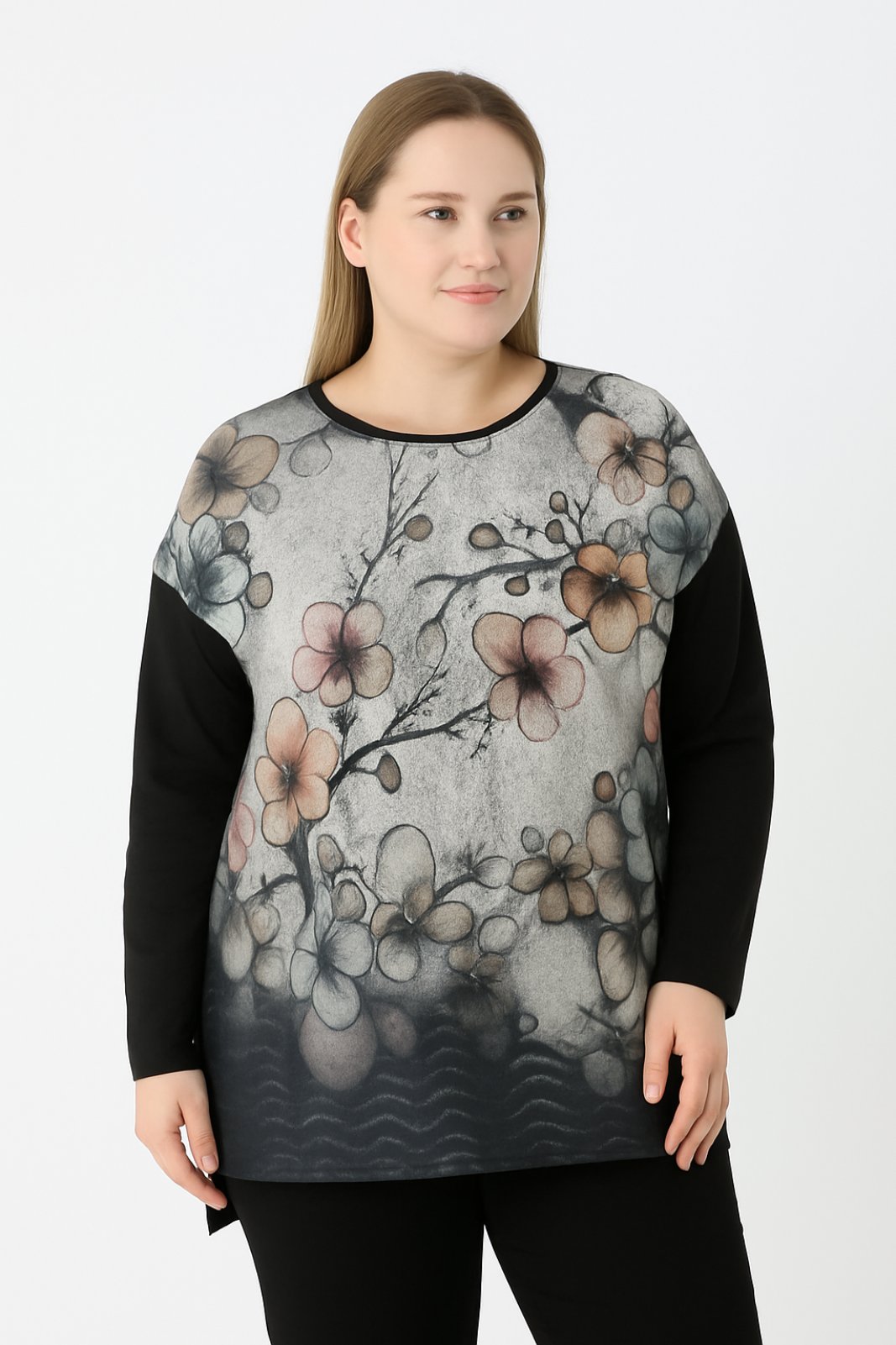 Γυναικεία Μπλούζα Xνουδωτό βισκοζ Flowers on the Branches Over Size Curve-Plus Size