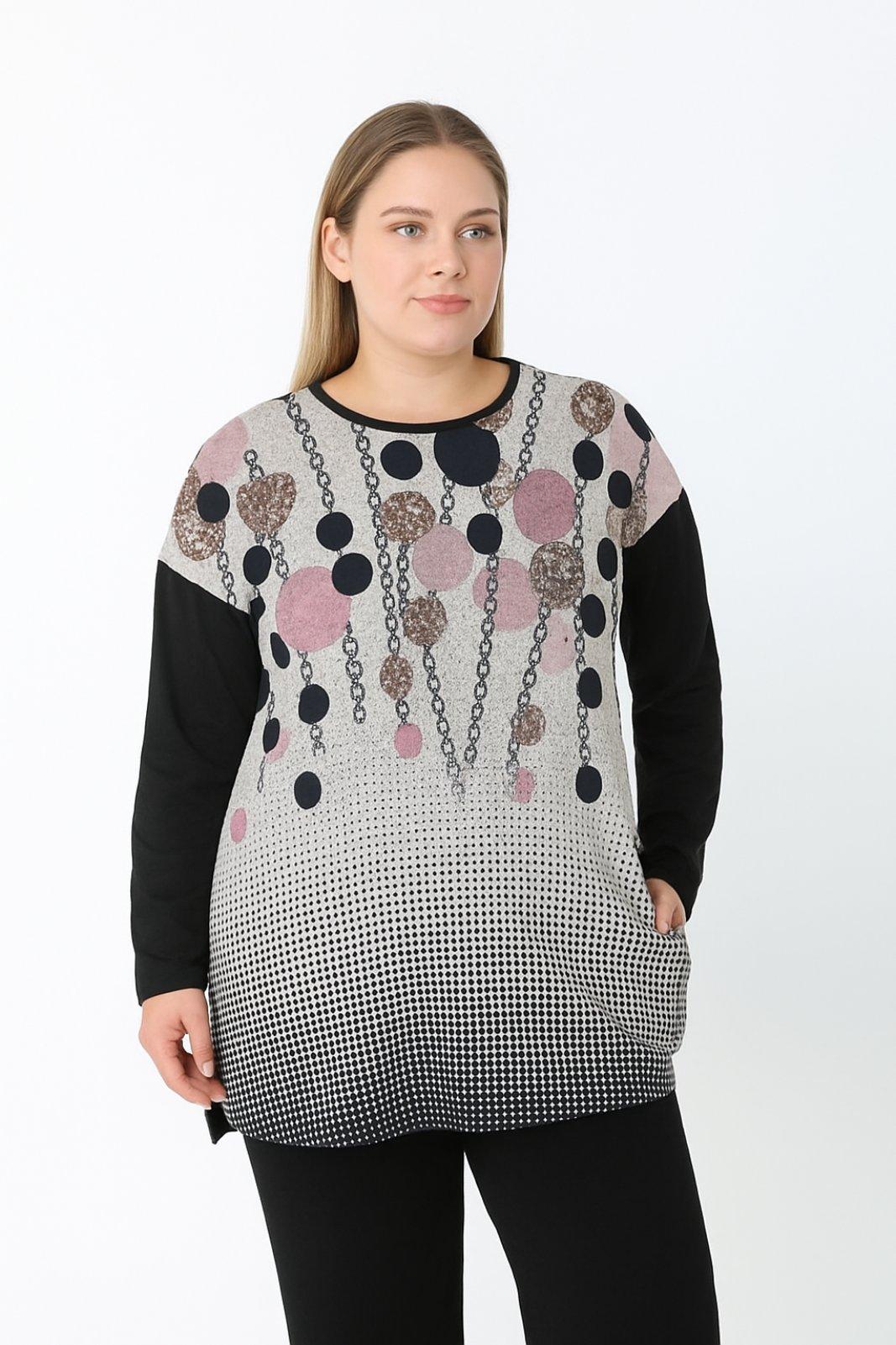Γυναικεία Μπλούζα Xνουδωτό βισκοζ Over Size Μαύρη/Γκρι με Μοτίβο Curve-Plus Size