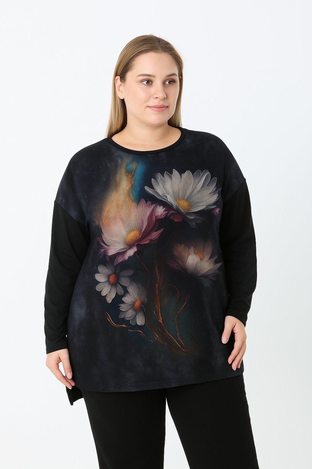 Γυναικεία Μπλούζα Xνουδωτό βισκοζ Over Size Μαύρη με Μοτίβο Λουλούδια Curve-Plus Size
