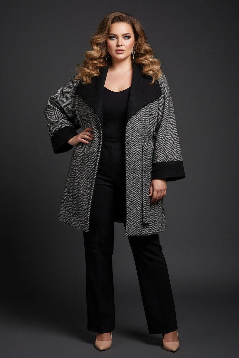 Γυναικεία Γυναικείο Παλτό βελούρ Με Τσέπες, Μοτίβο ψαροκόκαλο Μαύρο/Εκρού Curve-Plus Size