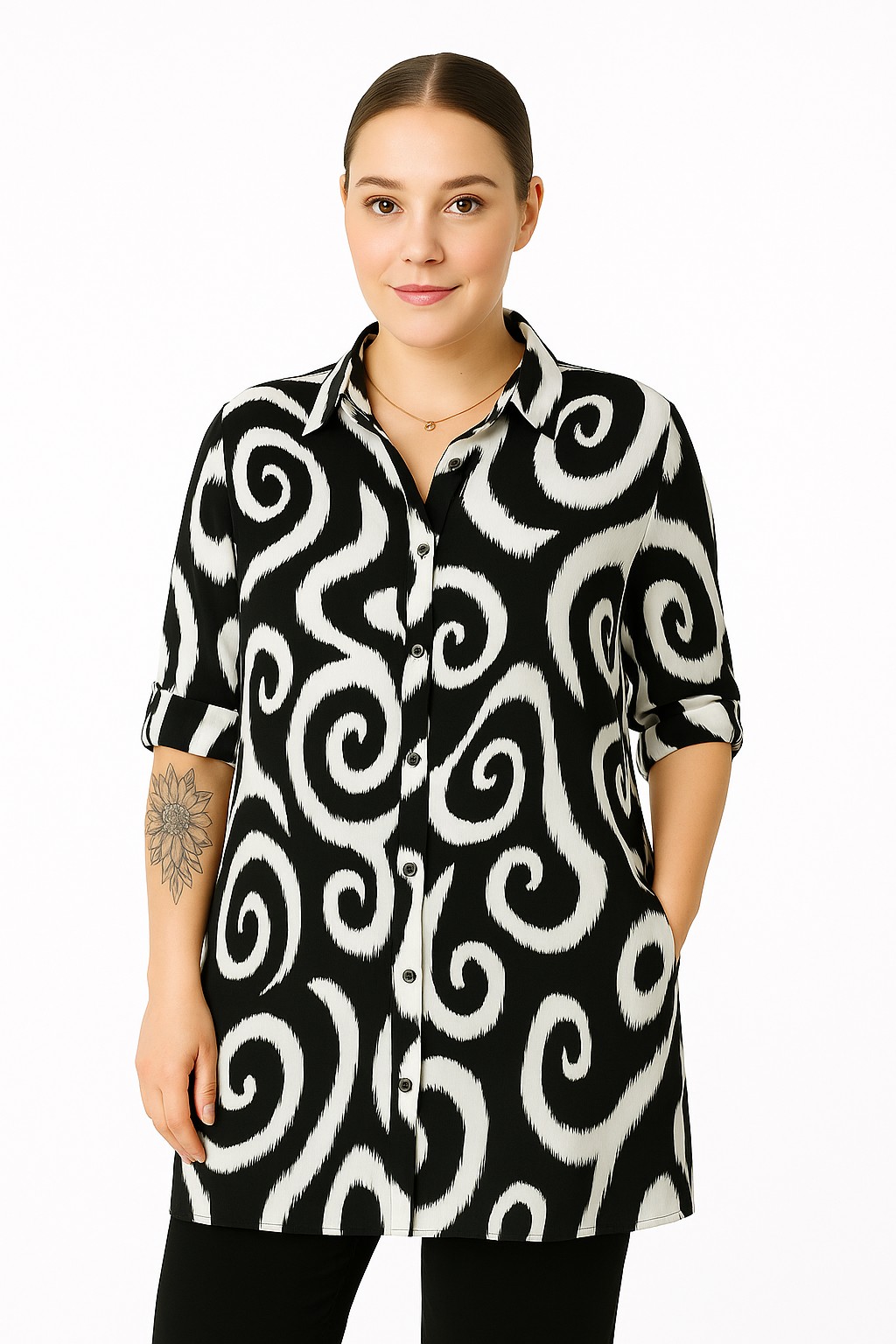 Γυναικεία Πουκάμισο Over Size Μαύρο Λευκό Ζικ Ζακ Μοτίβο Viscose Ελαστικό Curve-Plus Size