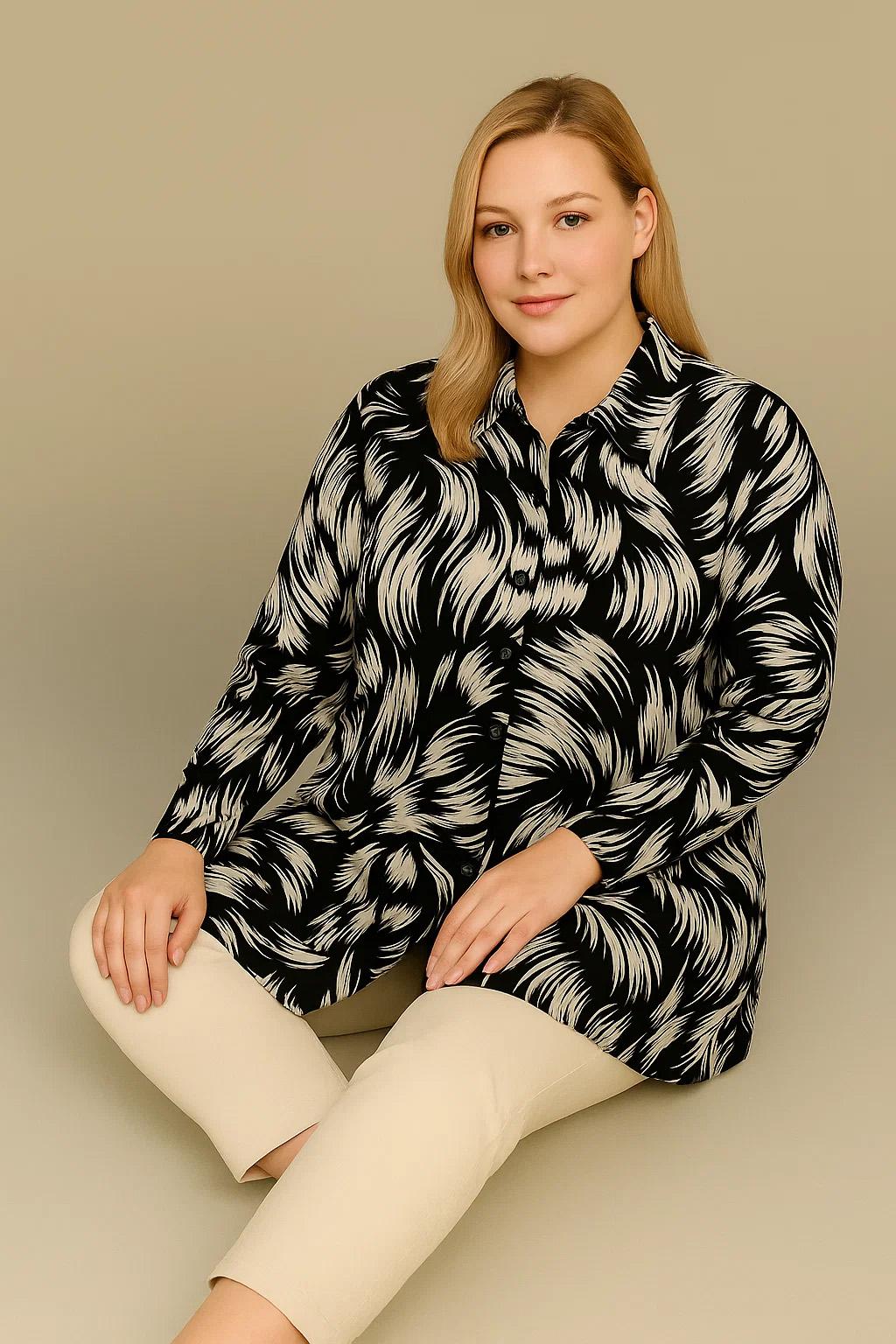 Γυναικεία Πουκάμισο Over Size Μαύρο Με Λευκό Μοτίβο Viscose Ελαστικό Curve-Plus Size