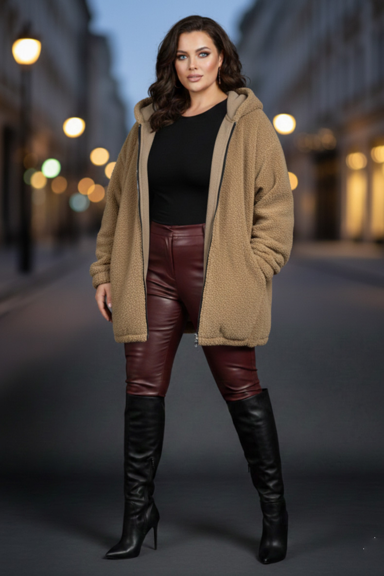 Γυναικεία Ζακέτα Μπεζ προβατάκι Με Κουκούλα Curve-Plus Size