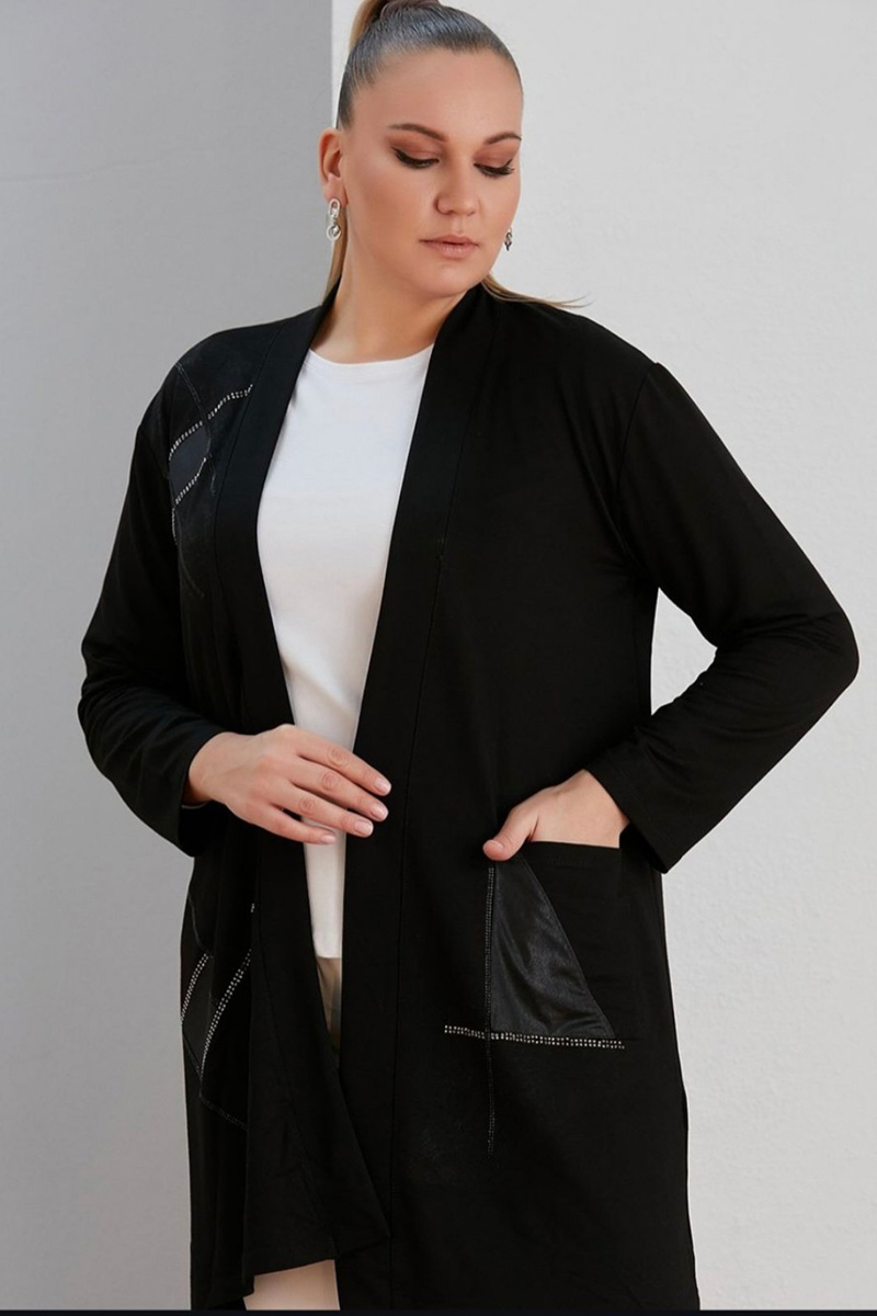 Γυναικεία Ζακέτα βισκοζ Μαύρη Με Λεπτομέρειες Δερματίνη , Plus Size