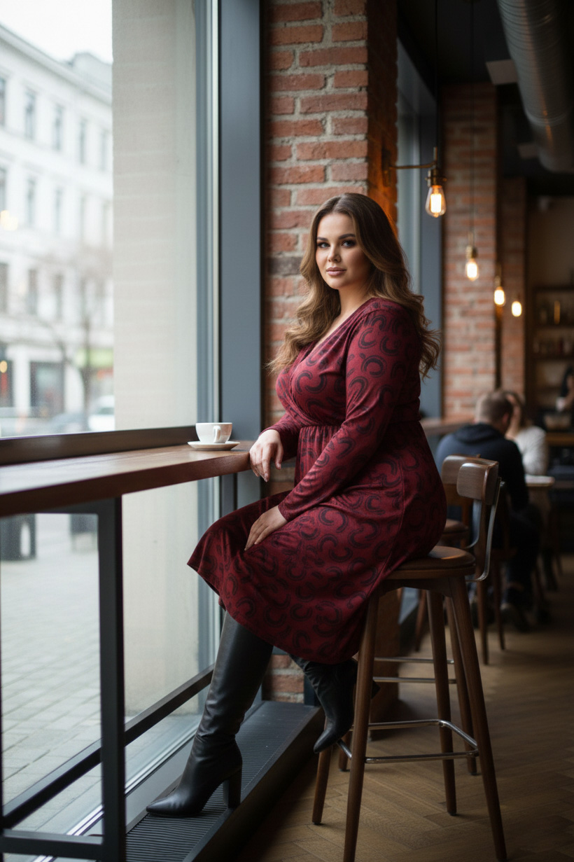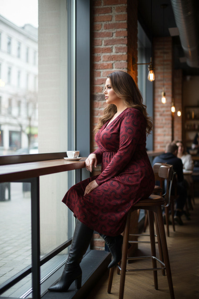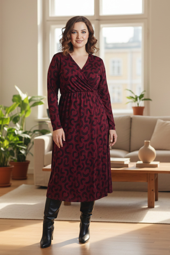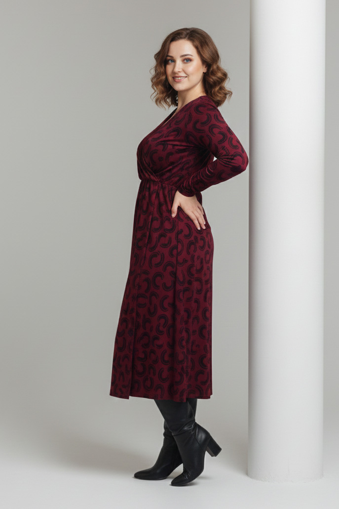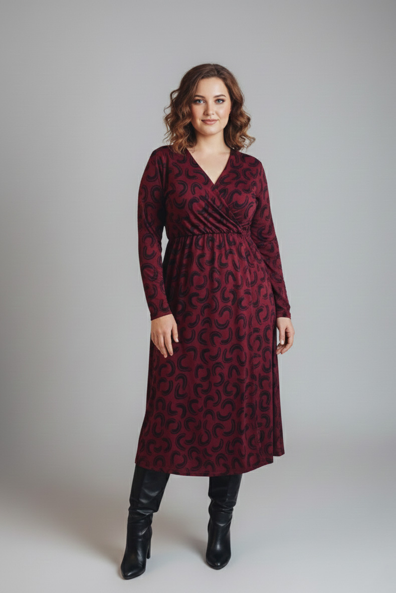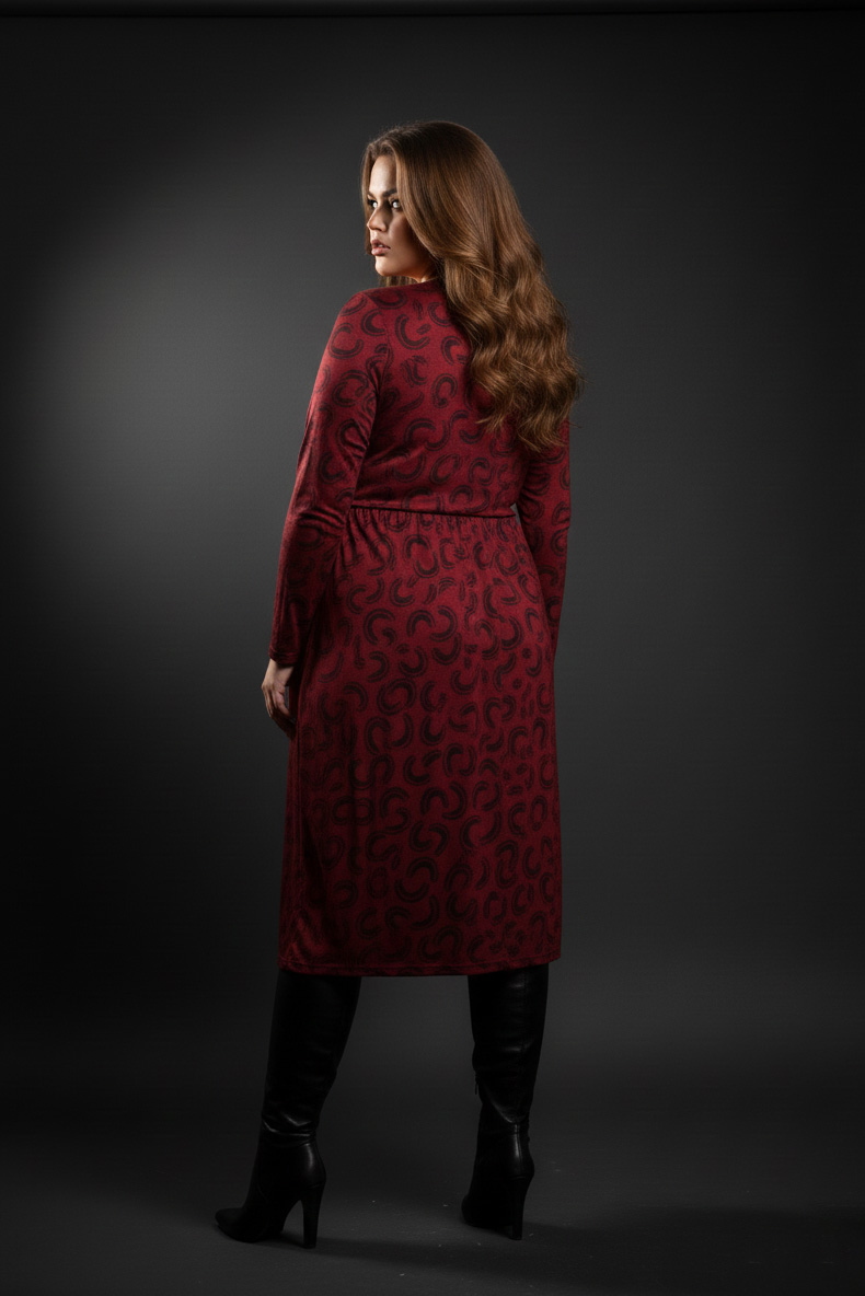 Γυναικείο Φόρεμα Χνουδωτό Λεπτό Πλεκτό Μπορντό Κρουαζέ Με Μαύρο Print Plus size