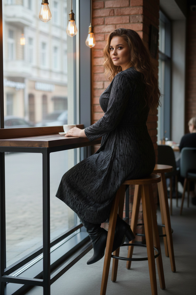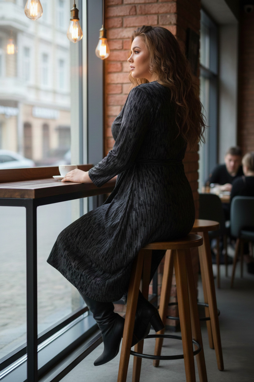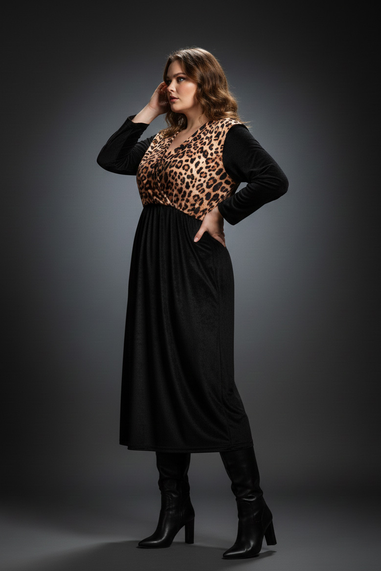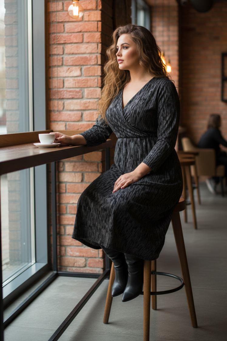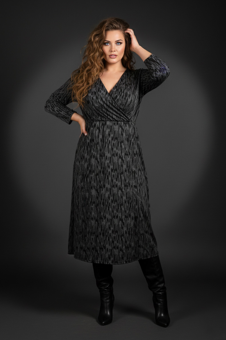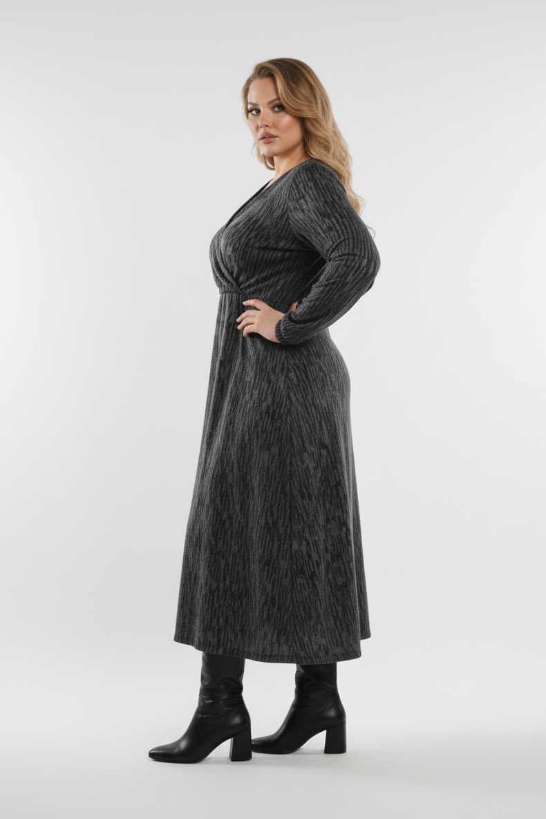 Γυναικείο Φόρεμα Χνουδωτό Λεπτό Πλεκτό Γκρι Κρουαζέ Με Μαύρο Μοτίβο Plus size