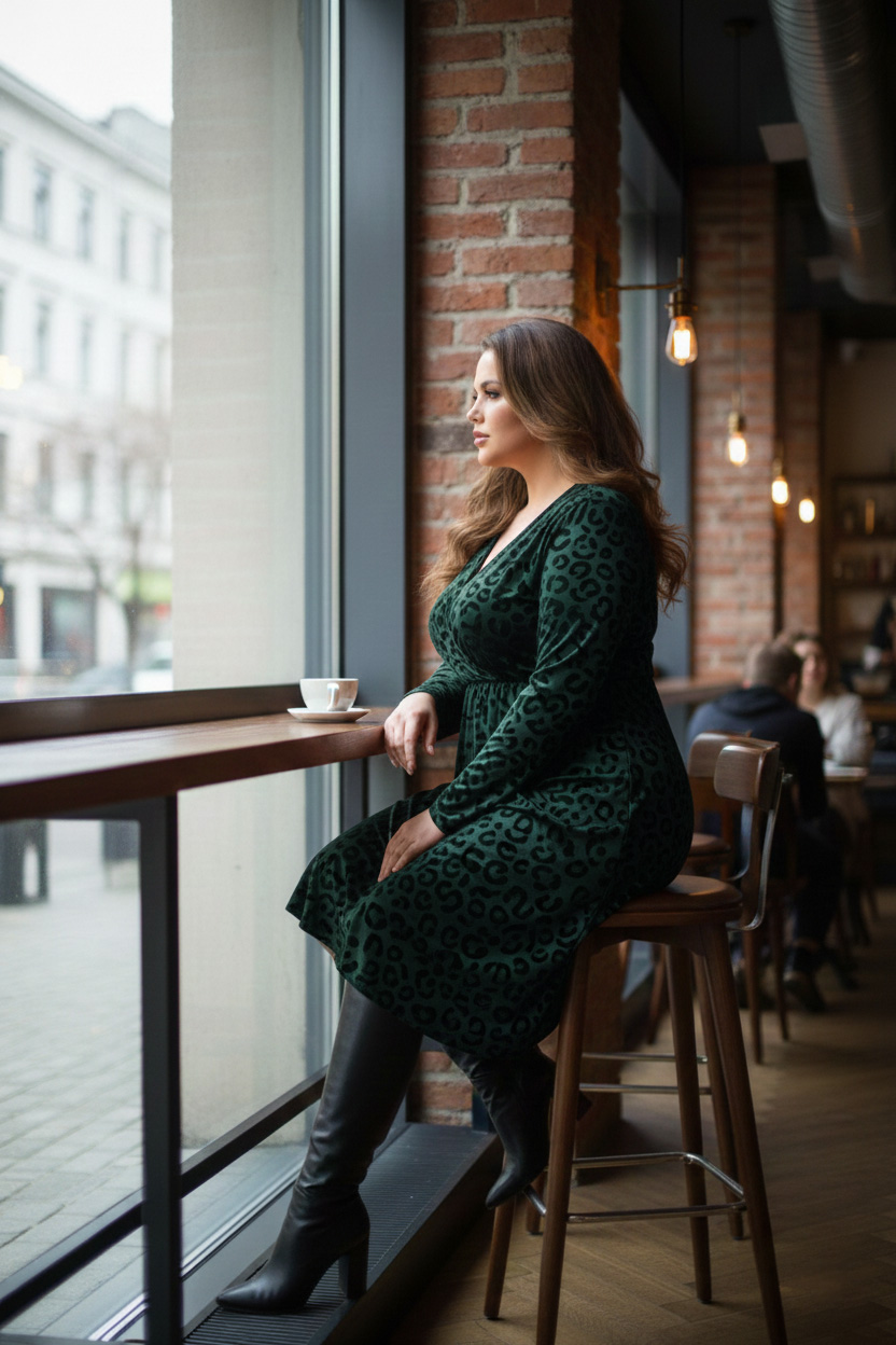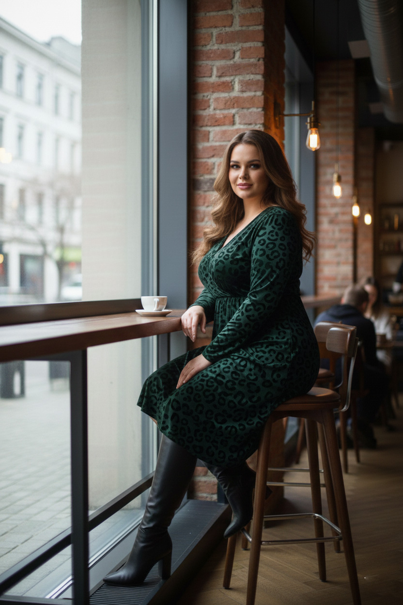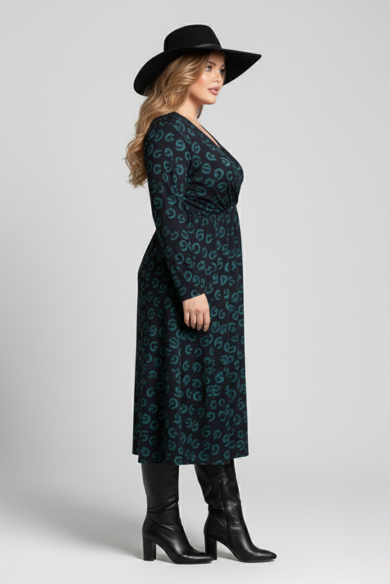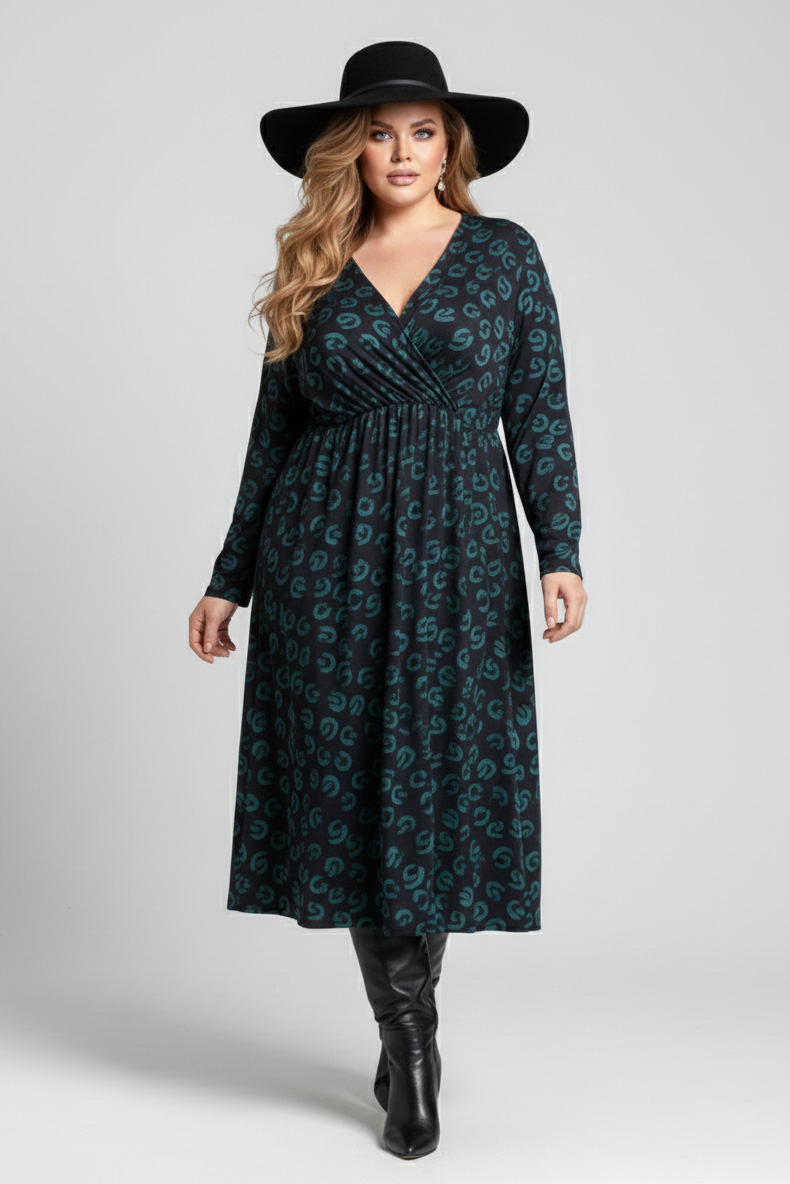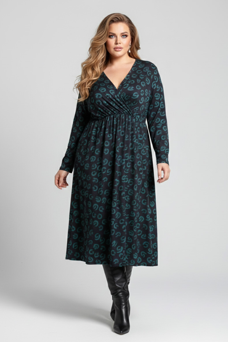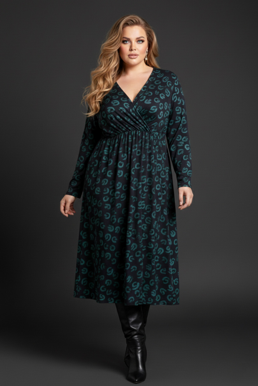 Γυναικείο Φόρεμα Χνουδωτό Λεπτό Πλεκτό Πράσινο Κρουαζέ Με Μαύρο Print Plus size