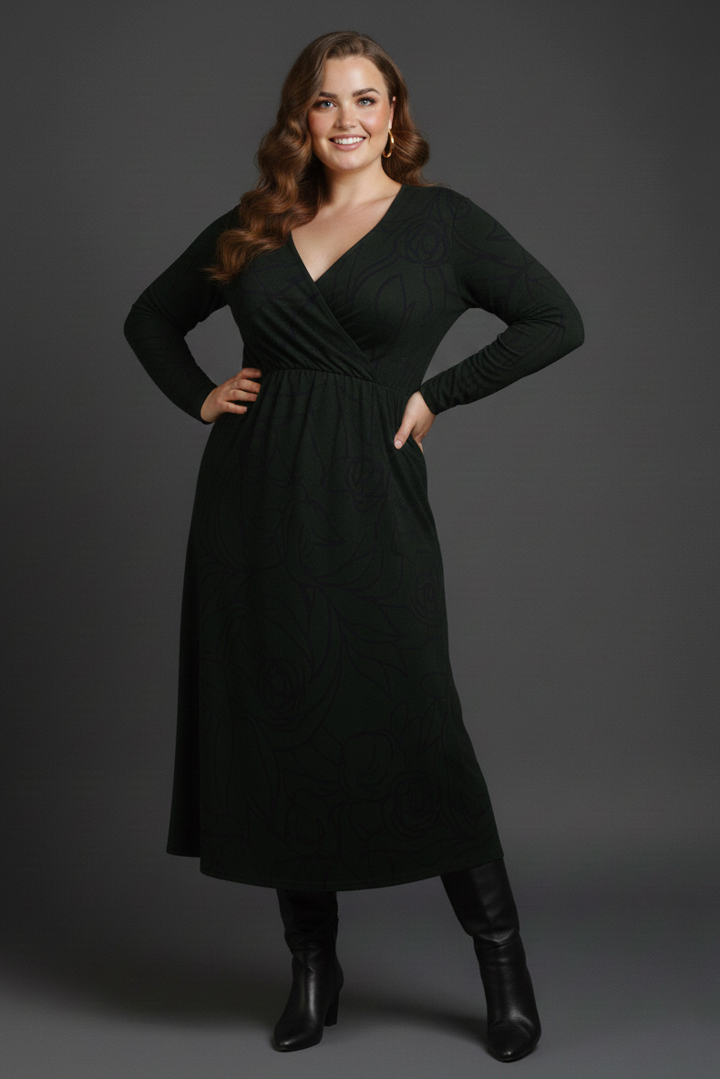 Γυναικείο Φόρεμα Λεπτό Πλεκτό Χακί Με Μοτίβο Μαύρο Plus size