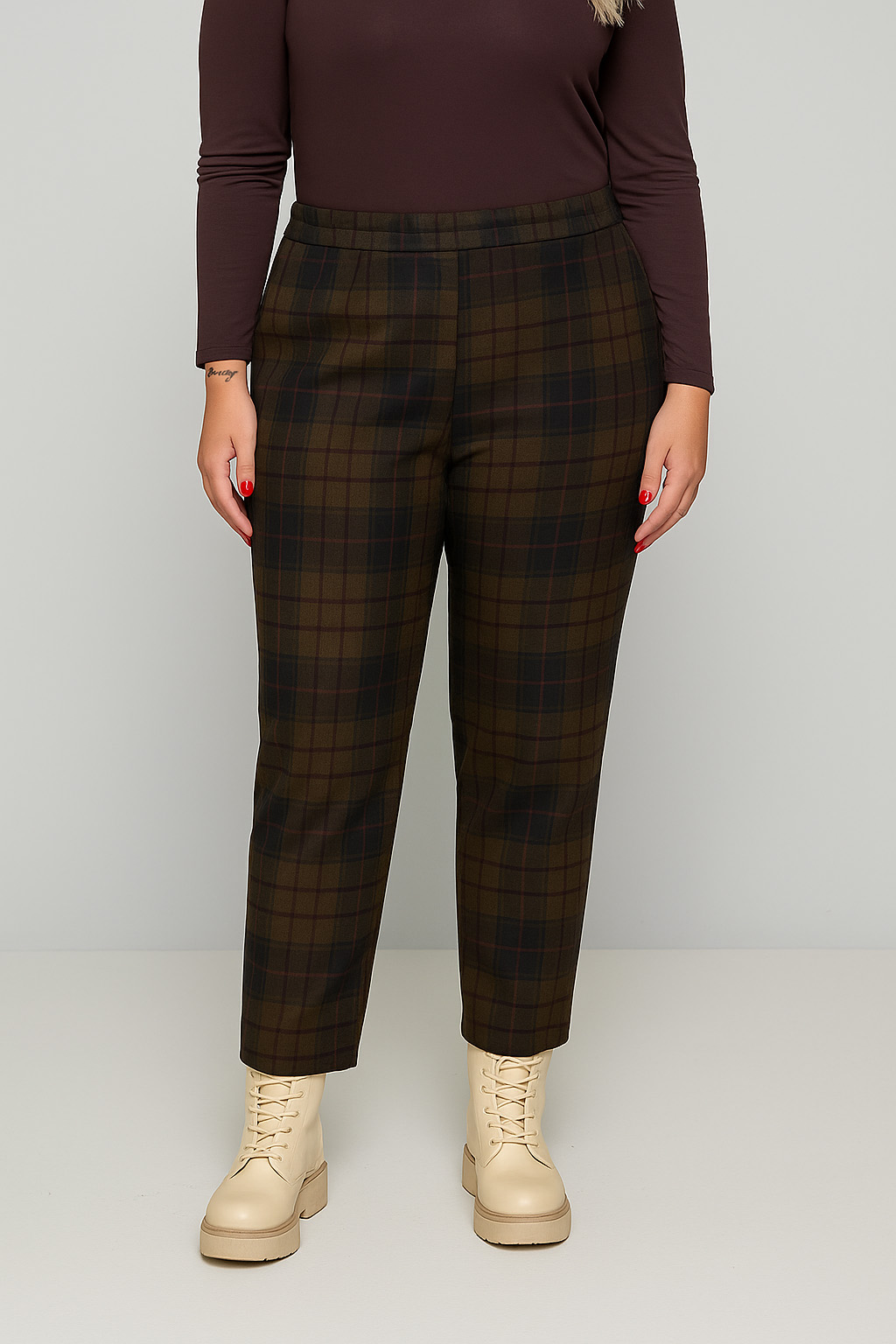 Γυναικείο Παντελόνι Καφέ Καρό Με Λάστιχο Πίσω Plus size
