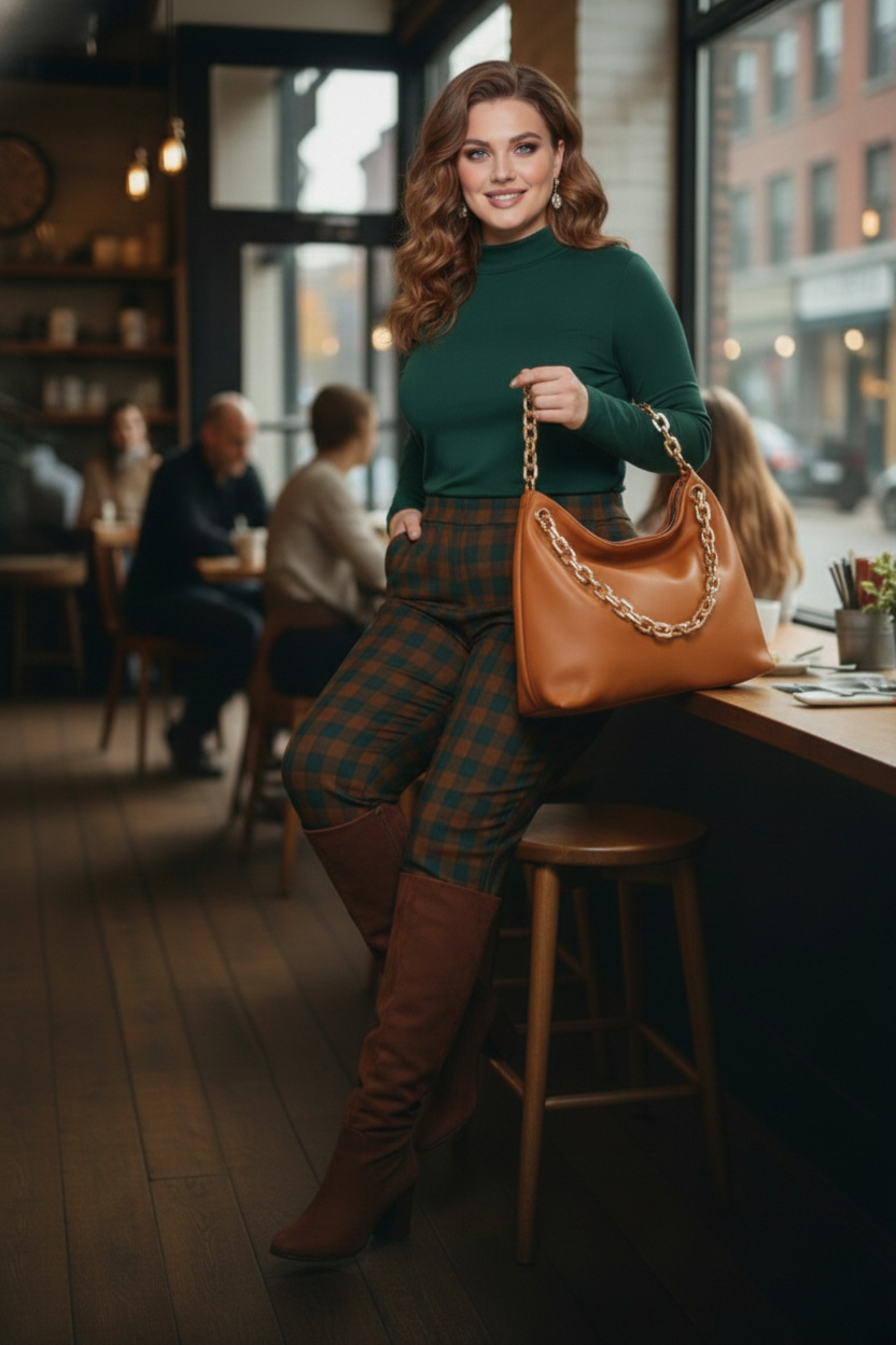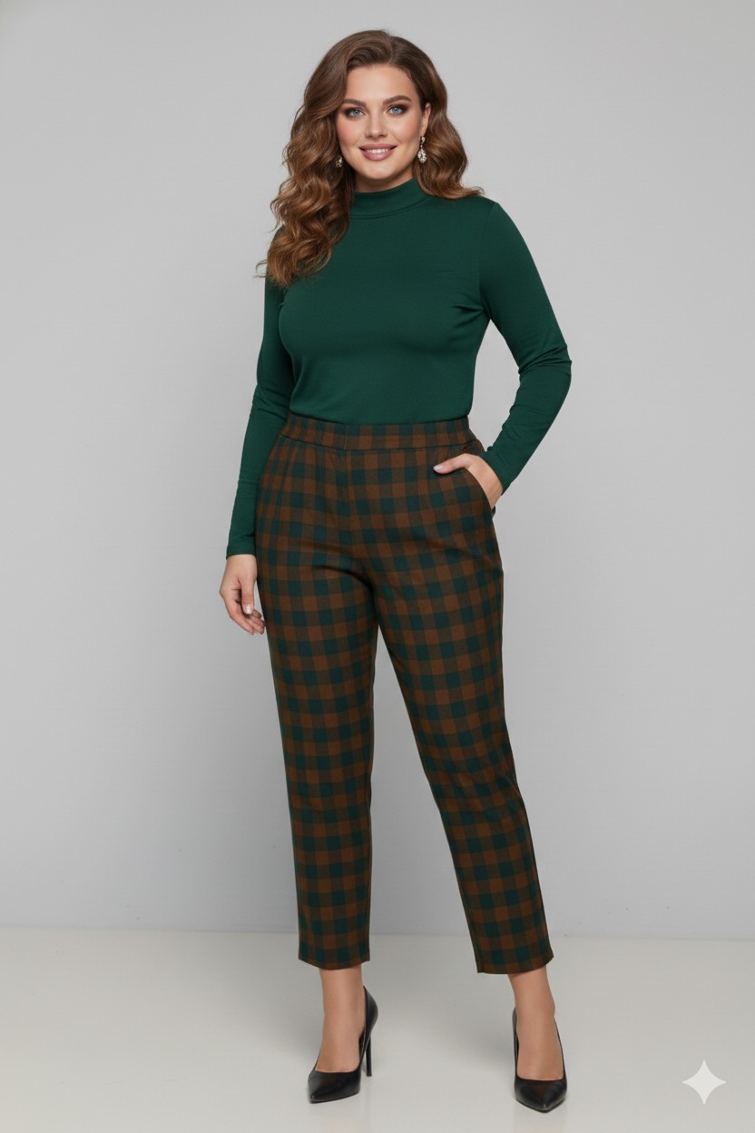 Γυναικείο Παντελόνι Καφέ Καρό Πετρολ Με Λάστιχο Πίσω Plus size
