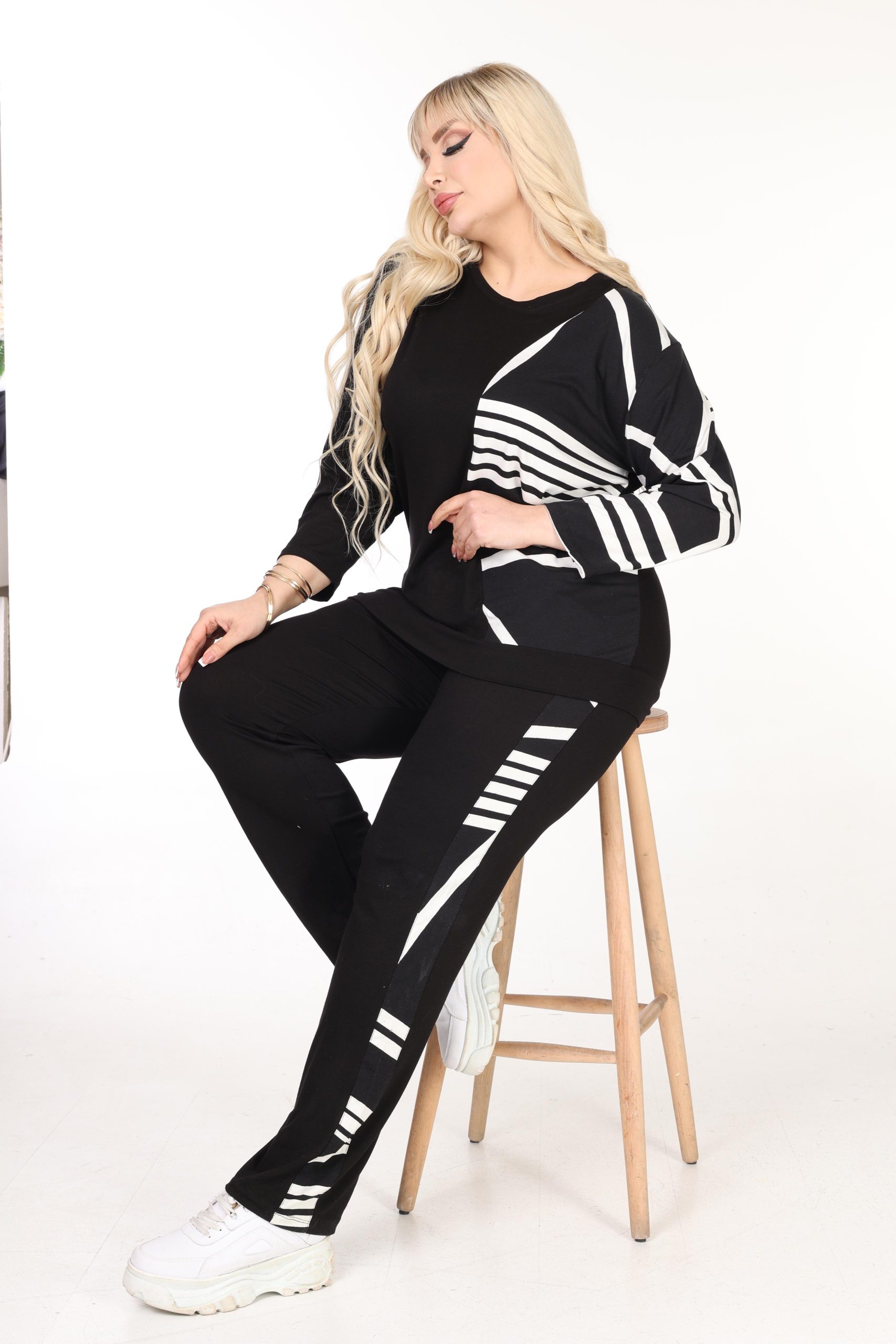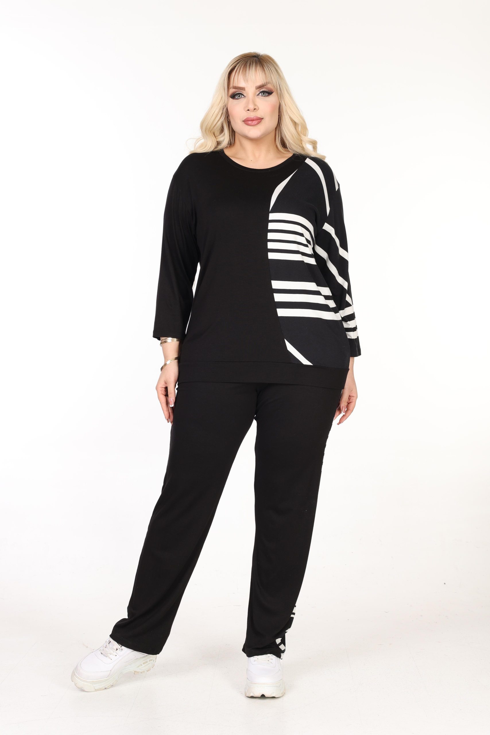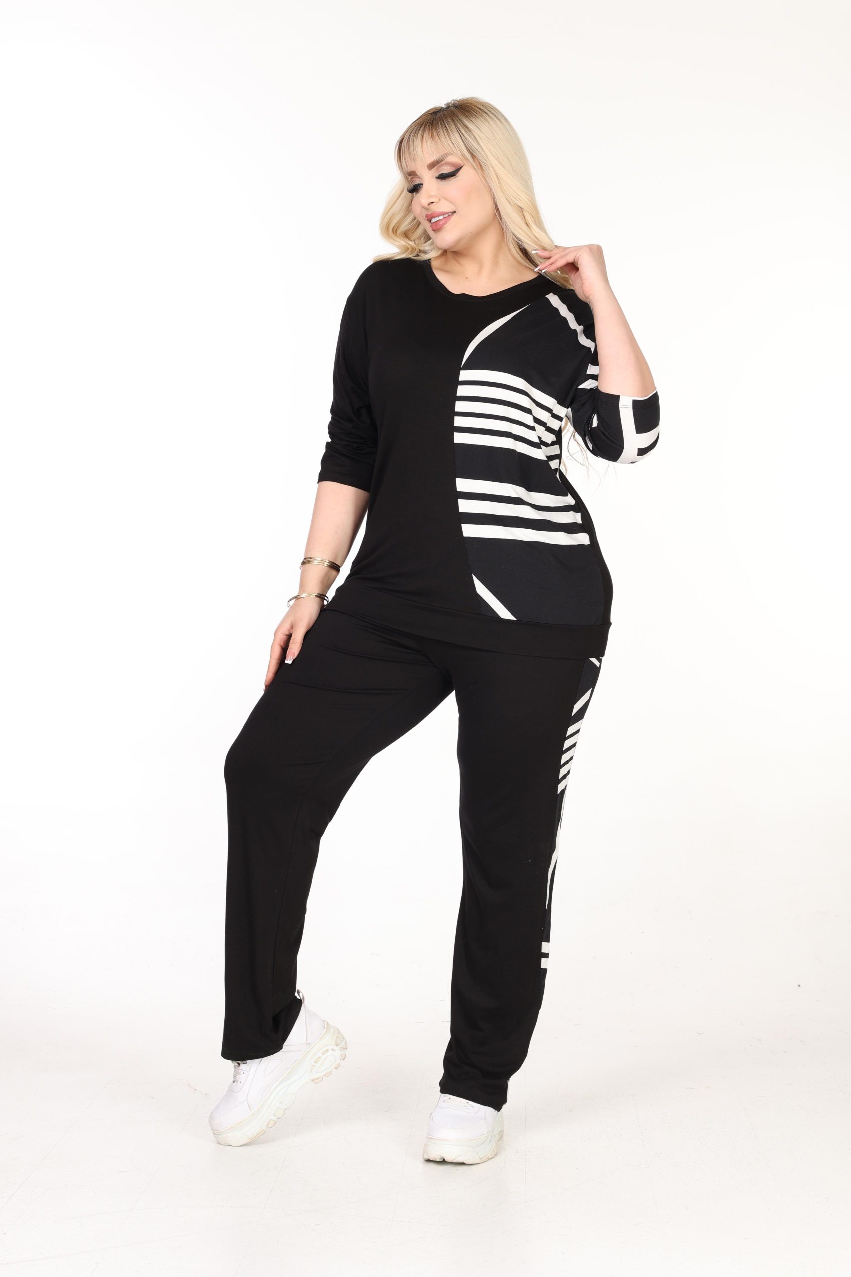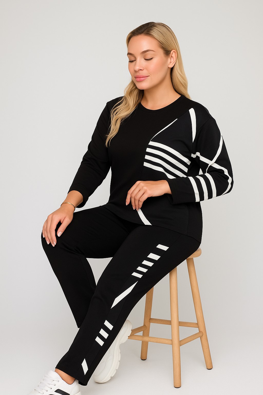 Γυναικείο Σετ φόρμα 3/4 σε μαύρο χρώμα με λευκές λεπτομέρειες σε βισκοζ λικρα Plus Size