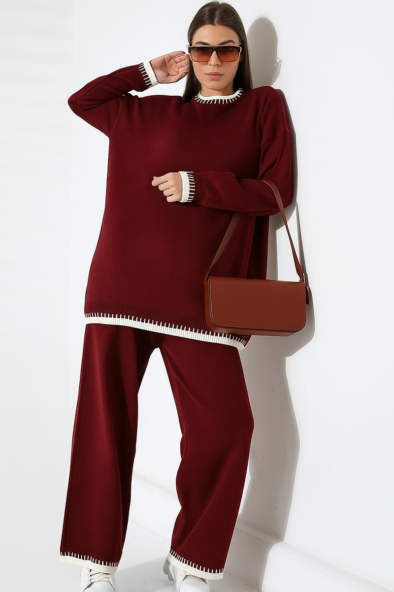 Γυναικείο Σετ Πλεκτό Μπορντό Μοτίβο Λευκό Plus Size