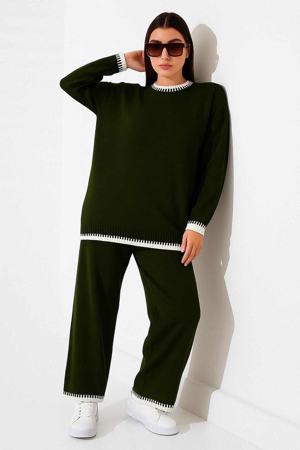 Γυναικείο Σετ Πλεκτό Χακί Μοτίβο Λευκό Plus Size